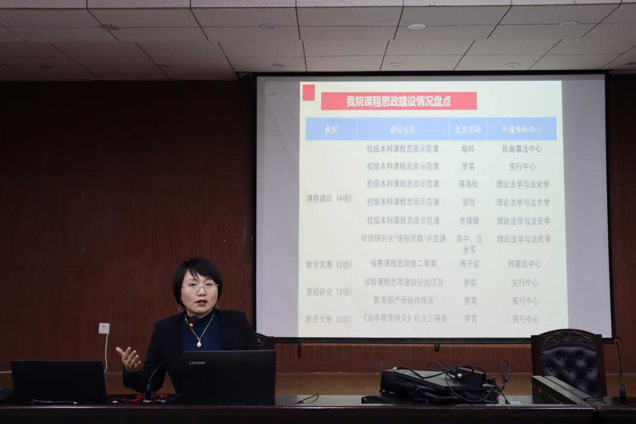 的特色文化积极挖掘教学素材和案例,比如结合时务学堂、李达校长与法学的渊源等素材,结合院史校史,融入人生态度、科学精神、社会责任、家国情怀等价值观,实现全程育人,做到润物细无声。她还介绍了法学专业课程思政研究中心筹划情况及未来开展工作的重点方向。
