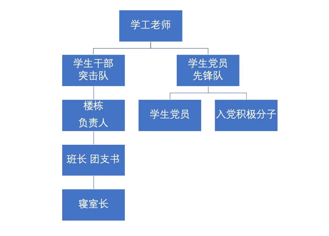 学生干部突击队和学生党员先锋队。一方面,由楼栋负责人、班长团支书、寝室长组成学生干部突击队,实现管控期间信息的上传下达;另一方面,充分调动储备的学生党员群体,建立以学生党员和入党积极分子为主体的五楼自拍