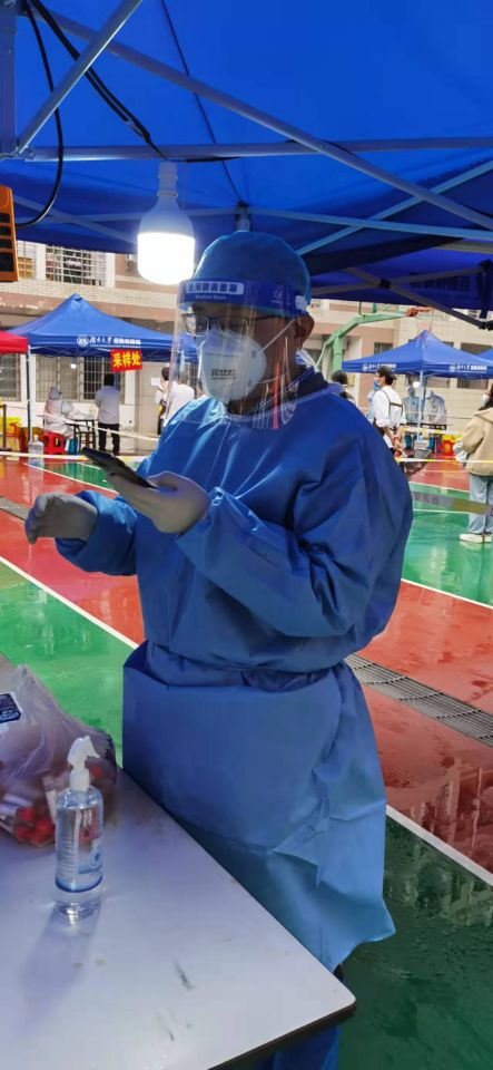 对同学们的浓烈感情,主动请缨担任志愿者。他协助医护人员采核酸,引导学生,维持现场秩序,录入二维码,登记相关信息,辛勤工作。