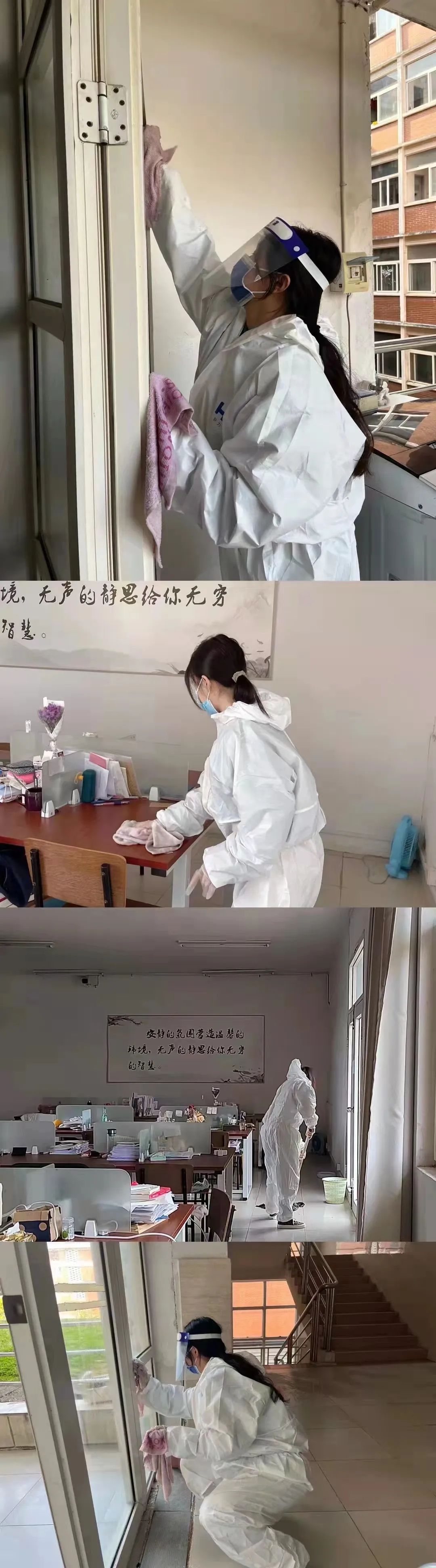 研究生志愿者们积极投身于清扫消杀活动。在充分做好个人防护措施与健康保障的前提下,按照五楼自拍