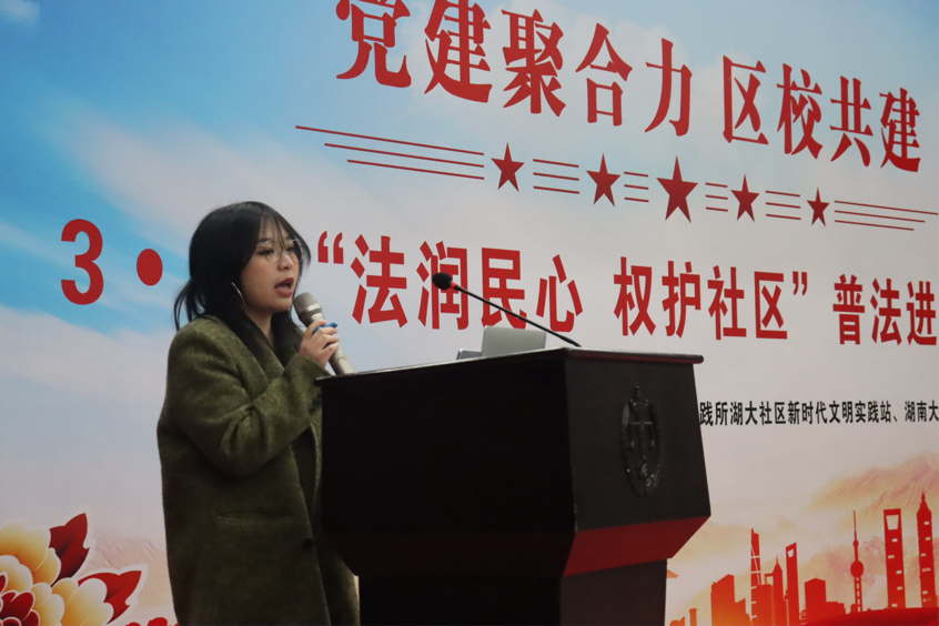 党务与学生工作办公室主任刘岳峰老师致辞,指出本次普法活动旨在将法律知识普及给居民并营造一个和谐法治社会.刘老师还简单介绍了后续即将开展的“岳麓法青”法律志愿服务队项目,通过志愿活动向居民提供持续的法律援助。同时向居民们发出倡议:“既要做法律的明白人,也要做邻里的传声筒,还要做社区的监督员”。居委会夏运枚主任结合社区实际,分享了在消费者权益保护方面的经验和方法,提出要将普法教育同社区建设有机结合,扎根基层、贴近群众。