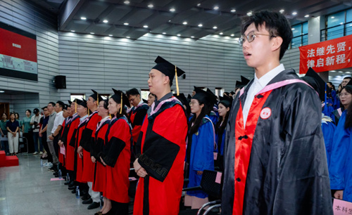 报告厅隆重举行。本次仪式涵盖本、硕、博全体毕业生,在庄严的国歌声中正式启幕。这是一个充满荣耀与期许的时刻,全体毕业生怀揣着对法治理想的坚定信念与对母校的深深眷恋参与毕业典礼。毕业生身着学位服齐聚现场,五楼自拍