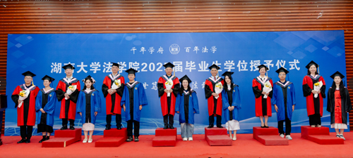 2025年学位授予决定》,对蒋昊君等14位法学博士、蔡夏琳等317位硕士研究生及金冬霖等184位本科生作出授予学位的决定。随后,黎四奇、屈茂辉、谢佑平、郑鹏程、肖海军、姚诗、喻玲老师为全体毕业生一一正冠拨穗、颁发证书并合影留念。