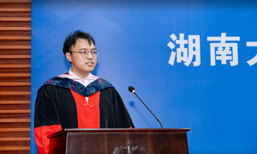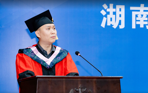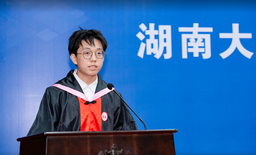 蒋昊君博士作为研究生代表登台发言。他首先回顾了在岳麓山下度过的宝贵求学时光,特别感谢导师周珂教授的培养。他高度赞扬周教授温润谦逊的品格、淡泊名利的情操以及对科研事业的执着坚守。即使在身体抱恙时,周教授仍引领学术前沿,其坚韧精神为学生照亮前路。在导师指导下,蒋昊君参与了国家社科重大课题,学术视野和人生格局均得到极大拓展。随后,蒋昊君表示,四年学习让他深刻理解了环境法学的真谛,坚定了“尊重、敬畏、保护自然”的信念,这将是他毕生的追求。他感言,母校的点滴记忆与青春情谊,将成为未来人生路上的温暖力量源泉。