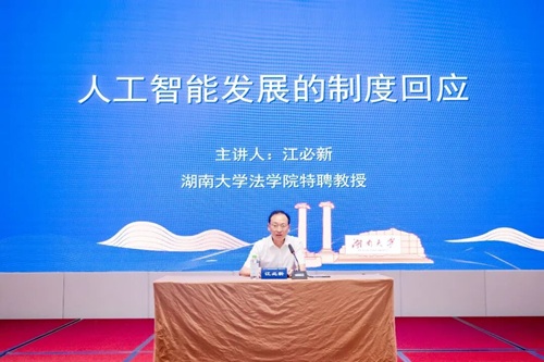 特聘教授江必新以“人工智能发展的制度回应”为题作精彩演讲。他系统梳理了当前人工智能法学理论创新的六大前沿领域——算法公平理论、数字人权理论、人工智能协同治理理论、道德漂移(外部性预防)理论、论证解释理论与人工智能代理责任理论,比较分析了欧盟、美国、英国、加拿大及中国等不同法域在人工智能治理上的制度模式差异,并就人工智能法律人格、知识产权归属、平台责任、人机协同等争议焦点分享了独到见解,为论坛后续研讨提供了坚实的理论框架和丰富的思辨线索。
