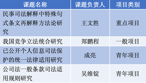 王文胜老师负责的《民事司法解释中特殊句式条文再解释方法论研究》获得重点项目立项。郑鹏程老师负责的《我国竞争立法统合研究》获得一般项目立项。成亮老师负责的《已公开个人信息司法保护的统一法律适用研究》以及吴维锭老师负责的《公司法一般条款司法适用规则研究》获得青年项目立项。