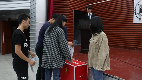 第十八届分团委、学生会工作报告》,院学生会副主席杨翱飞作《资格审查报告》。各项报告依次宣读并提请大会审议通过后,大会公布《选举办法》,主持人张准宣读总监票人、监票人、总计票人、计票人名单草案。草案提请大会表决通过后,各位代表认真履行职责,本着公平、公正的原则投票选举产生出第十九届分团委、学生会委员。在全体监票人和计票人的严谨工作下,大会选举张子政、程睿铮、王乐、马琳、常成、王哲、刘卜豪、郭泽楷、王梦、马朵、王丹彤11位同学为五楼自拍