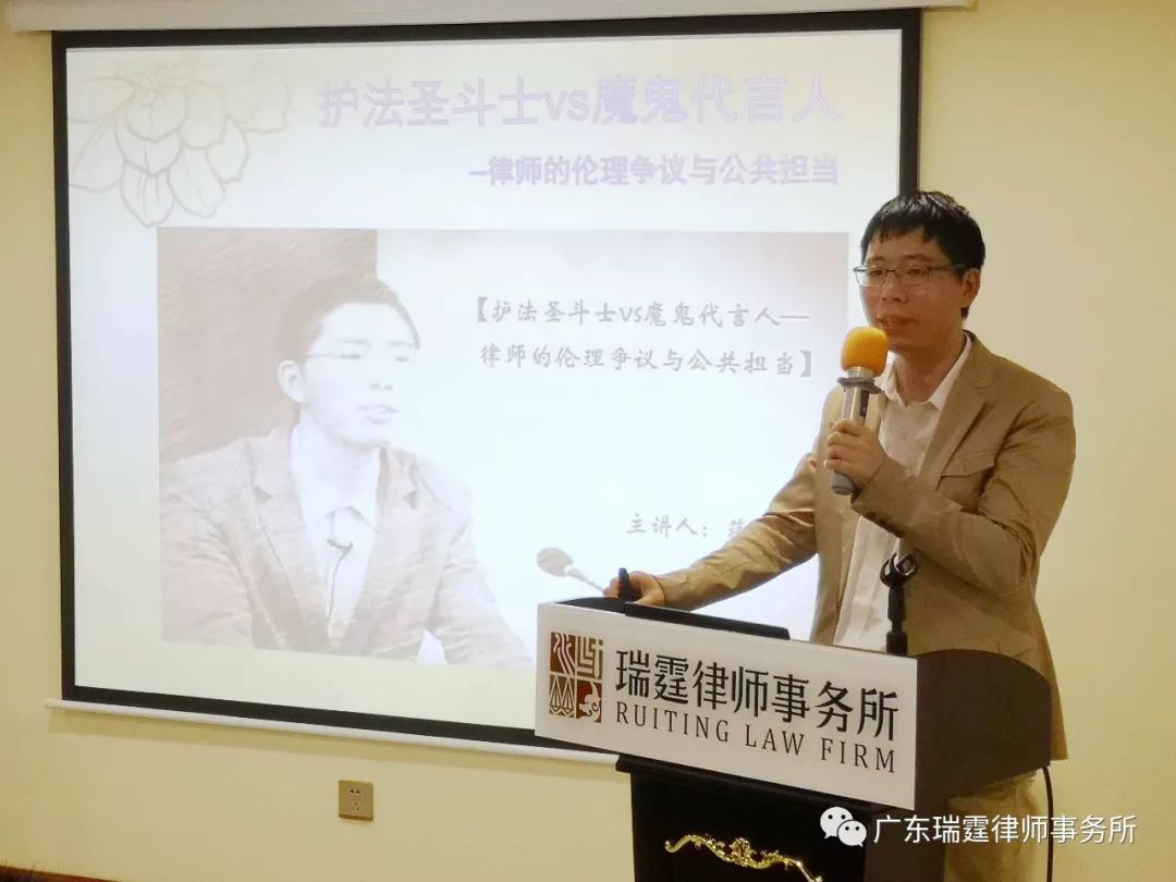 2018928日,受广东深圳瑞霆律师事务所邀请,五楼自拍 副教授蒋海松老师赴深圳进行“瑞霆大讲堂”第三期学术讲座《魔鬼代言人VS护法圣斗士—律师职业伦理二重性拷问》。瑞霆律师事务所主任王丽娜、执行主任王先友及深圳市福田区诸多律师事务所主任学员等共计40余人参与讲座,本次讲座由高级合伙人林志平主持、副主任陆晖致欢迎辞。
