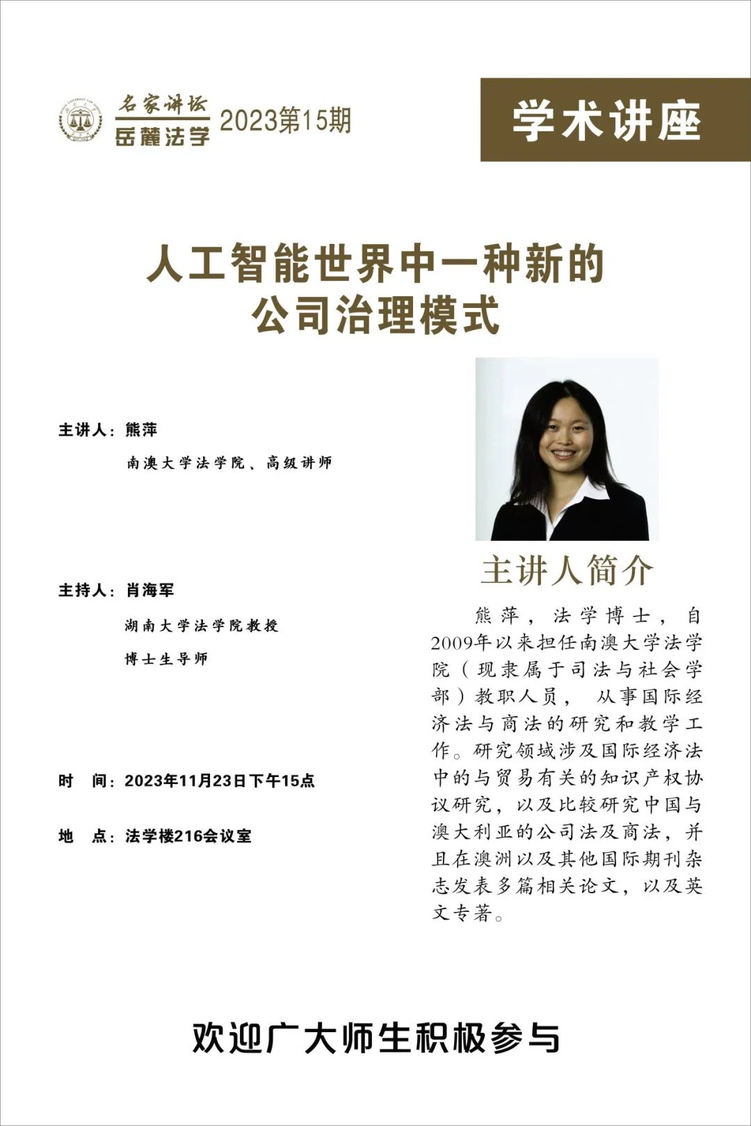 熊萍,法学博士,自2009年以来担任南澳大学五楼自拍