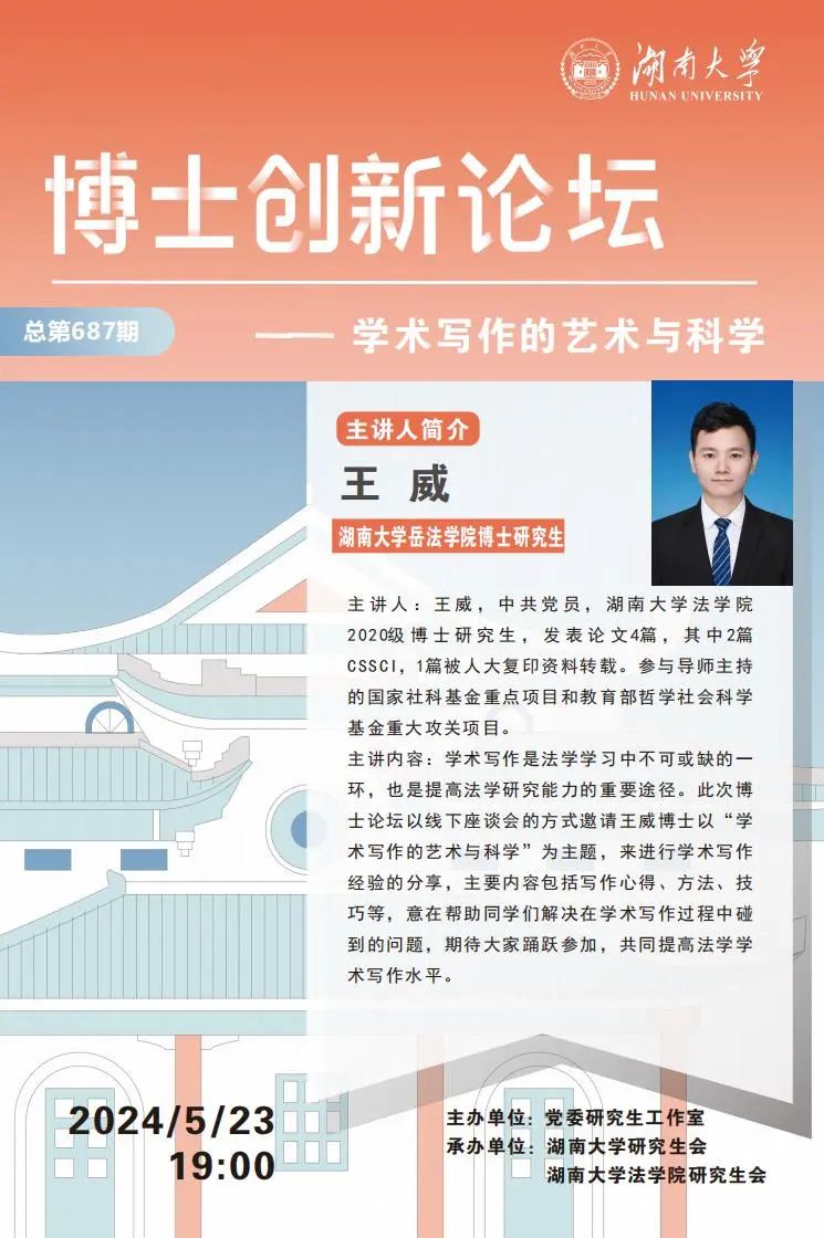 学术写作是法学学习中不可或缺的一环,也是提高法学研究能力的重要途径。此次博士论坛以线下座谈会的方式邀请王威博士以“学术写作的艺术与科学”为主题,来进行学术写作经验的分享,主要内容包括写作心得、方法、技巧等,意在帮助同学们解决在学术写作过程中碰到的问题,期待大家踊跃参加,共同提高法学学术写作水平。
