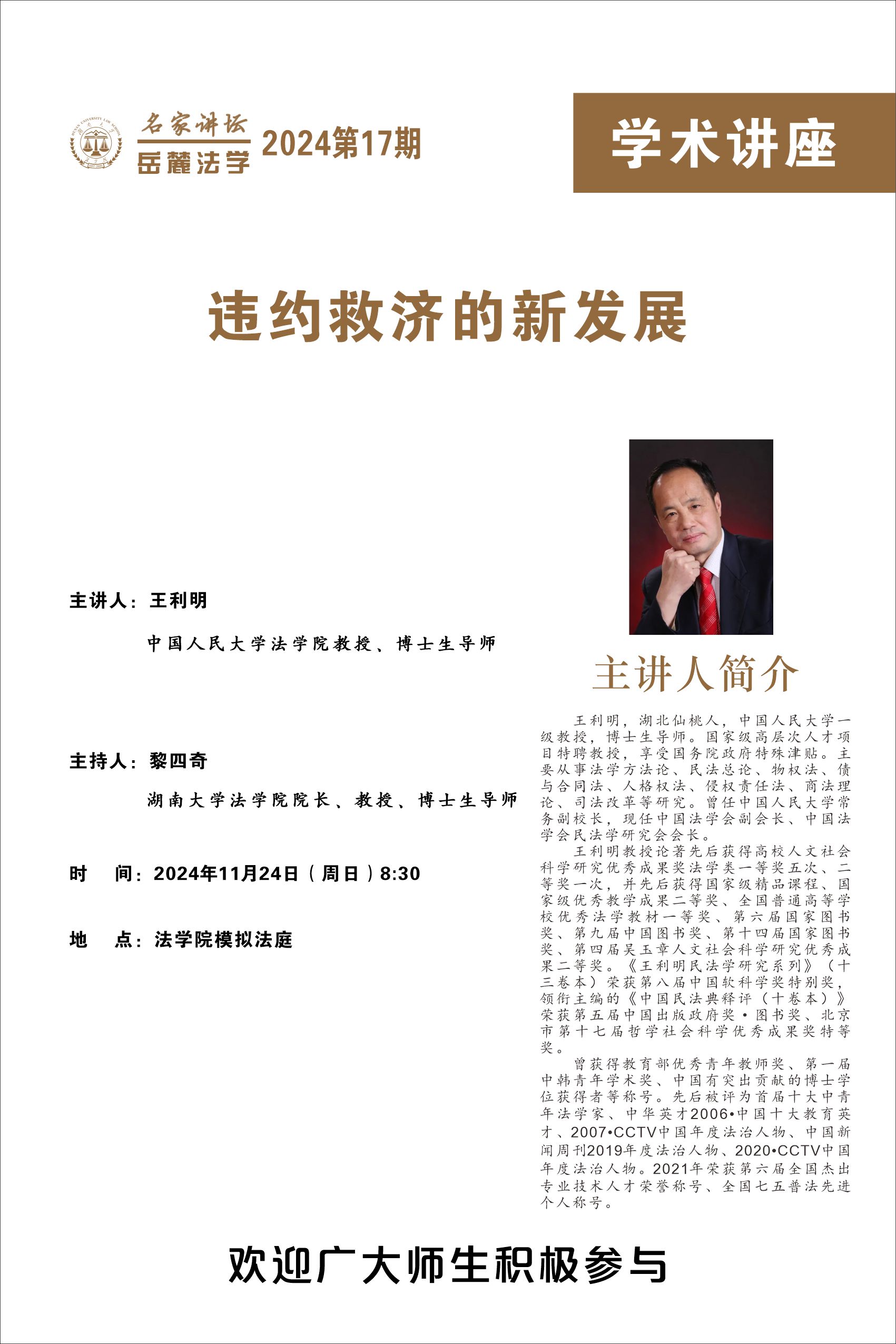 王利明,湖北仙桃人,中国人民大学一级教授,博士生导师。国家级高层次人才项目特聘教授,享受国务院政府特殊津贴。主要从事法学方法论、民法总论、物权法、债与合同法、人格权法、侵权责任法、商法理论、司法改革等研究。曾任中国人民大学常务副校长,现任中国法学会副会长、中国法学会民法学研究会会长。