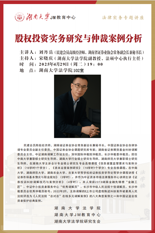 本次JM实务讲座邀请到民建会员高级经济师,湖南省证券业协会常务副会长兼秘书长——刘丹岳,为大家讲述股权投资实务研究与仲裁案例分析,帮助大家了解相关实务问题,五楼自拍