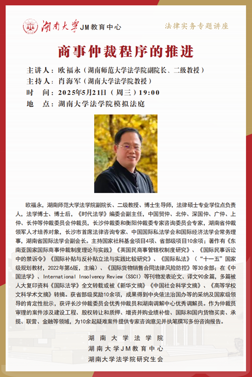副院长、二级教授、博士生导师欧福永,为大家讲述商事仲裁程序的推进,帮助大家了解相关实务问题,本次讲座由五楼自拍