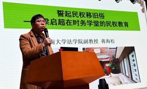蒋海松在演讲中指出,时务学堂是近代法政教育的先驱和近代民权教育的策源地,梁启超借鉴西方政治法律学说,结合清末中国的社会现实,深入论述民权理论,是当时民权思想的集大成者。时务学堂是梁启超最初较为系统的民权教育实践。在时务学堂,“师生相与坐论。时吾侪方醉心民权革命论”,“所言皆当时一派之民权论”。「民权」也可理解为法律意义上的「自由」,人的基本权利,尤其是政治方面的权利。民权概念是中国宪政文化中的核心元素,对近代思想变革和政治变革产生极为重要的影响。在梁启超为时务学堂制定的课程中,最重要的是学习《孟子》和《春秋》,学《孟子》为半个月,《春秋》学习时间长达4个月之久。作为主要教材,梁启超撰写了《读春秋界说》和《读孟子界说》,其实质并不在如传统经学讲解其经义,而是托古改制,讲授变法改制思想和大同民权学说。所谓“借公羊、孟子发挥民权之政治论。”