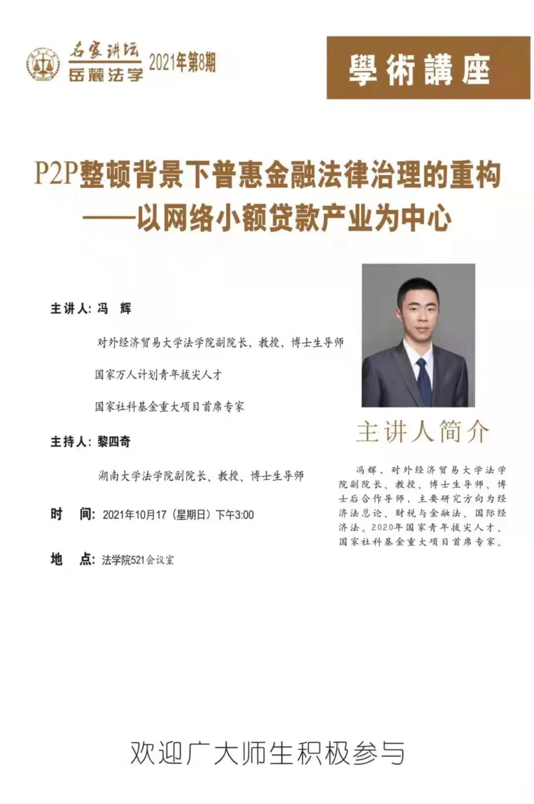 521会议室带来以“P2P整顿背景下普惠金融法律治理的重构——以网络小额贷款产业为中心”为主题的精彩的学术讲座。此次讲座由五楼自拍
