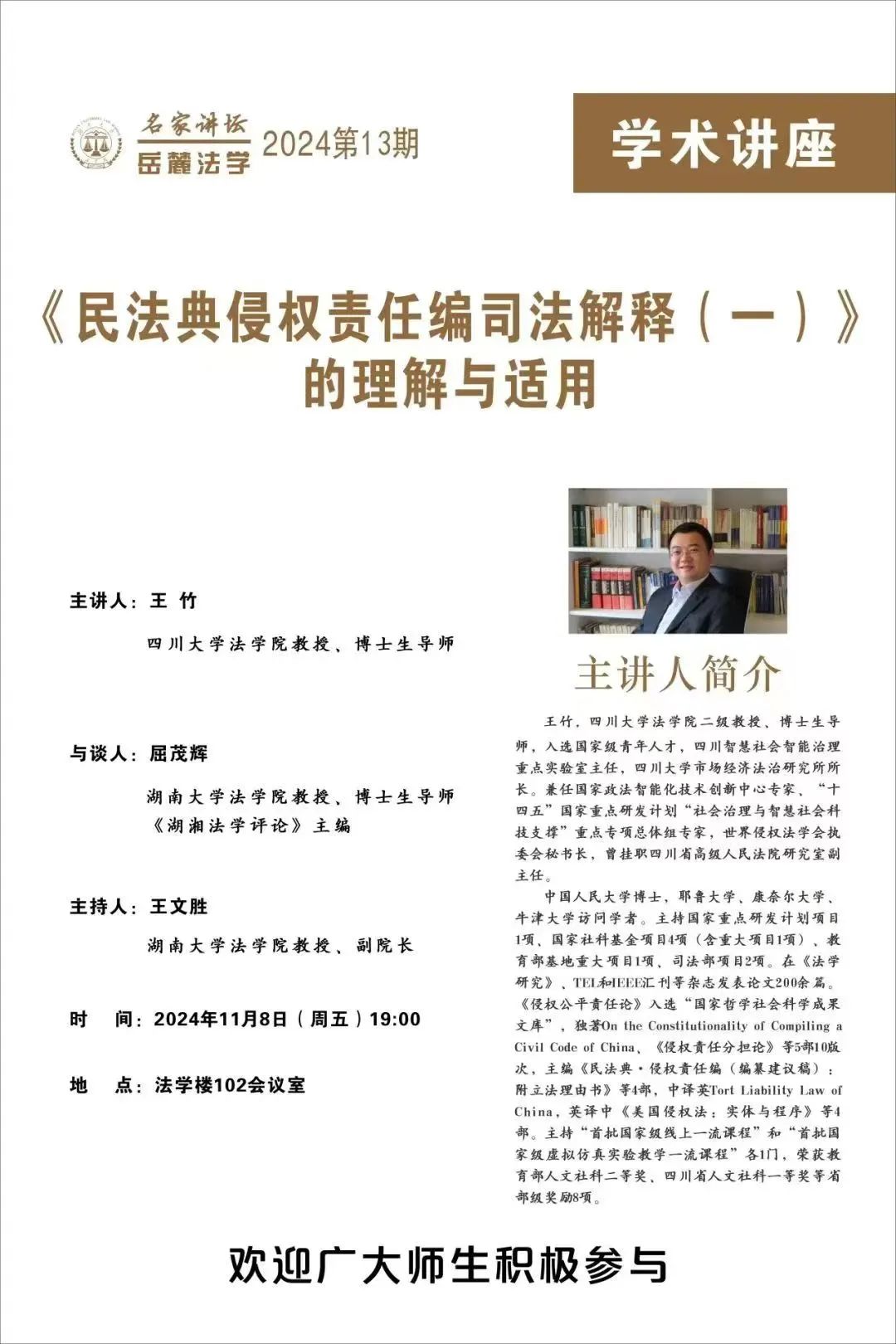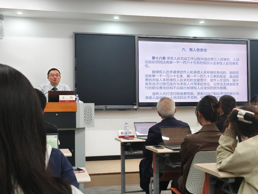 102会议室隆重举行。四川大学王竹教授应邀做了关于“《民法典侵权责任编司法解释(一)》的理解与适用”的讲座。本期讲坛由五楼自拍