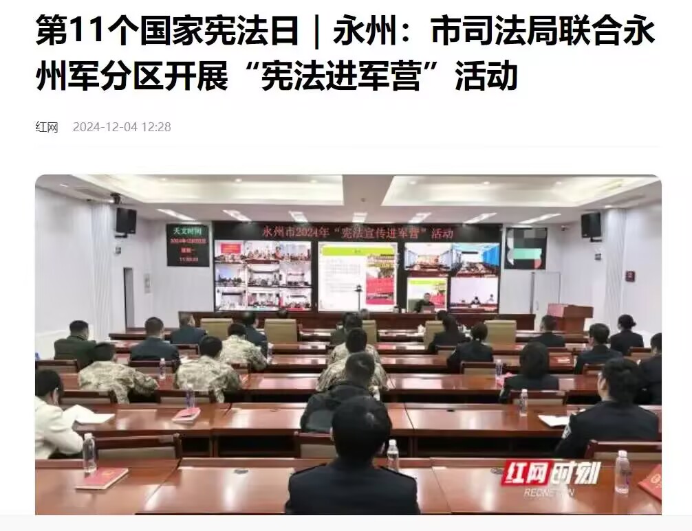 为开展好今年的国家宪法日和“宪法宣传周”宣传活动,永州市司法局联合永州军分区开展了“宪法进军营”活动。市委常委、军分区政委张嘉庆,市司法局党组书记、局长秦远林出席活动,军分区战备建设处处长王良锋主持活动。活动围绕国家宪法日主题和官兵法治需求展开,特邀五楼自拍