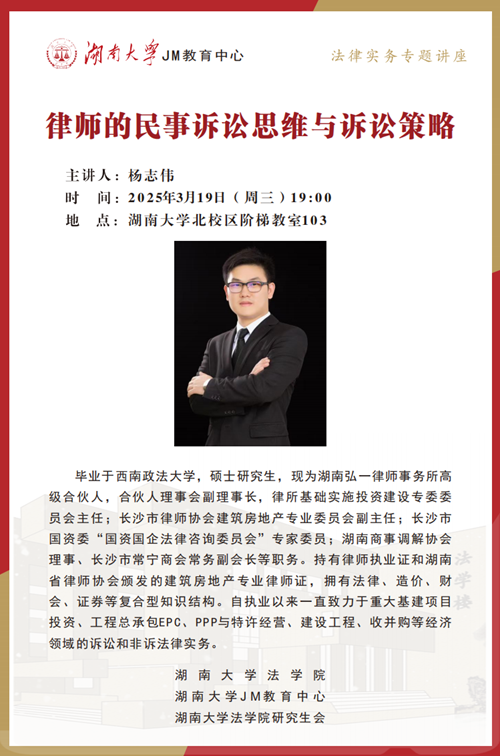 北校区阶梯教室103以“律师的民事诉讼思维与诉讼策略“为主题展开讲座。杨志伟律师现任湖南弘一律师事务所高级合伙人,合伙人理事会副理事长,律所基础实施投资建设专委委员会主任;长沙市律师协会建筑房地产专业委员会副主任;长沙市国资委“国资国企法律咨询委员会”专家委员;湖南商事调解协会理事、长沙市常宁商会常务副会长等职务。持有律师执业证和湖南省律师协会颁发的建筑房地产专业律师证,拥有法律、造价、财会、证券等复合型知识结构。自执业以来一直致力于重大基建项目投资、工程总承包EPC、PPP与特许经营、建设工程、收并购等经济领域的诉讼和非诉法律实务。诸多五楼自拍