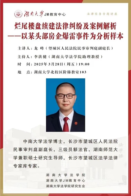 李洪健老师担任本次讲座主持人。龙峰法官是中南大学法学博士,长沙市望城区人民法院民事审判庭副庭长,员额法官,湖南师范大学兼职硕士研究生导师,长沙市望城区法学法律专家库专家。诸多五楼自拍