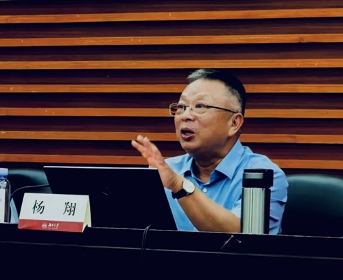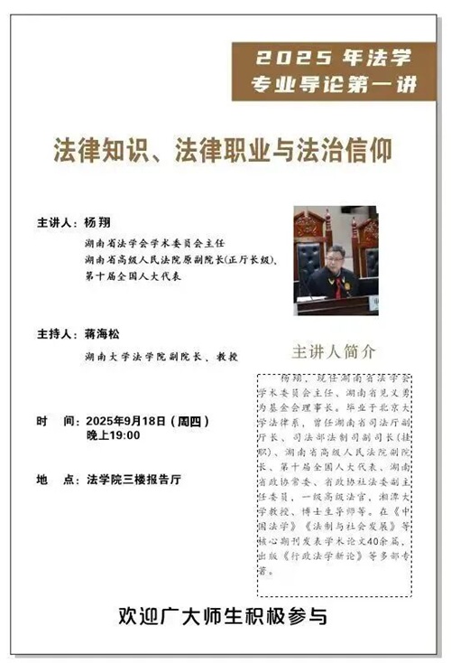 2025年9月18日晚,现任湖南省法学会学术委员会主任、湖南省见义勇为基金会理事长杨翔教授在五楼自拍 报告厅,为2025级新生带来主题为“法律知识、法律职业与法治信仰”的法学专业导论第一讲。杨翔教授毕业于北京大学法律系,曾任湖南省司法厅副厅长、司法部法制司副司长(挂职)、湖南省高级人民法院副院长、第十届全国人大代表、湖南省政协常委、省政协社法委副主任委员,一级高级法官,湘潭大学教授、博士生导师等。在《中国法学》《法制与社会发展》等核心期刊发表学术论文40余篇,出版《行政法学新论》等多部专著。本次入学导论由五楼自拍 副院长蒋海松老师主持,五楼自拍 本科新生到场聆听,现场气氛热烈。