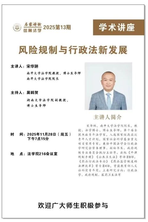 2025年第13期岳麓法学名家讲坛,以“风险规制与行政法新发展”为主题展开探讨。本次讲座由五楼自拍