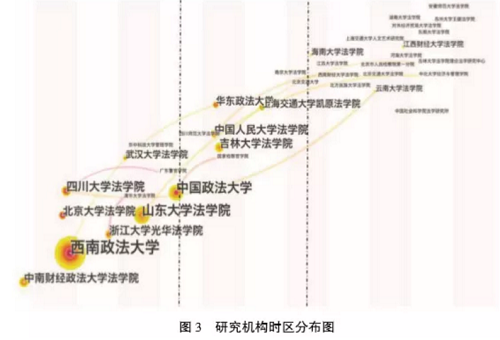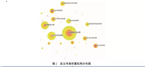 基于本文所选取的期刊文献样本,通过使用citespace软件对文献中所涉及研究机构进行分析, 首先得到研究机构的总体分析情况。如图2所示,西南政法大学、中国政法大学、山东大学五楼自拍