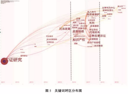 为进一步明确基于裁判文书法学实证研究所涉及的具体研究内容之发展,本文通过citespace 软件得出关键词时区分布图。如图5 所示,自基于裁判文书法学实证研究成果得到显著增长以 来,研究成果中所出现关键词的时区分布同样呈现出较为明确的三个阶段。2011年至2015年之间,研究成果中所出现关键词的总量与年度增量均不大,甚至可以称之为匮乏。并且,本阶段所出现的为数不多的关键词中,半数以上均可明确被归类于刑事诉讼领域,如量刑程序、量刑、量刑建议等。2016年与2017年,关键词数量急剧增长,呈爆发状态。关键词类型同样得到一定程度的丰富, 知识产权、证券等领域归属明确的关键词出现,也说明基于裁判文书法学实证研究所涉及之领域得到拓展。由于在第一阶段末期,即司法改革的总体规划和具体方案陆续出台之际,司法改革作为 研究成果关键词出现,且其与第二阶段关键词存在密切的共现关系,即可认为,第二阶段研究关键词数量急剧增长在一定程度上得益于当前研究热点与基于裁判文书法学实证研究的密切关联性。当然,与前一发展阶段一致,在本阶段之中,刑事诉讼领域关键词仍然大量存在,如刑事司法、死刑以及受贿罪等。2018年至今,关键词数量急转直下,且呈逐年下降之势。由于2018年所出现之关 键词主要与司法改革相关,如庭审实质化、以审判为中心等,且该相关性在2019年随之减弱,即可认 为,该阶段关键词数量下降同样可在一定程度上归结于司法改革作为研究热点的消退。同时,这也可以在一定程度上对近年来参与本领域研究的研究机构数量增多而研究成果数量反而下降之现象 予以解释。即随着研究热点消退,研究者们的个体产量逐渐下降,即便有新的研究机构加入,也无法阻止研究成果总量的下降。
