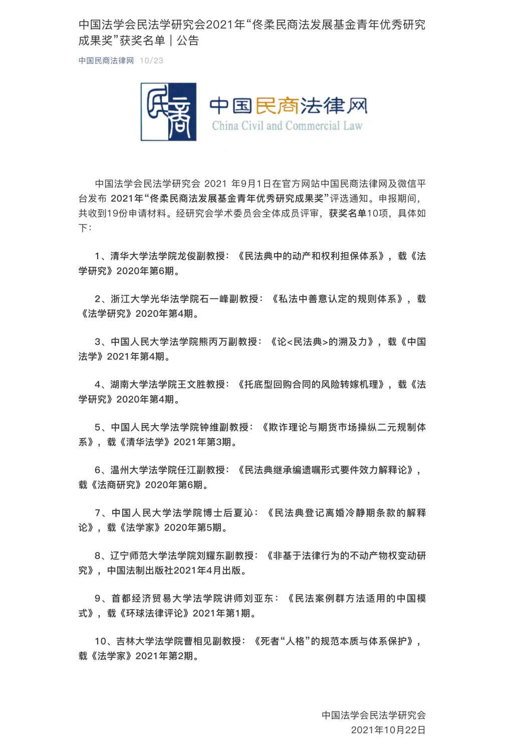 2021年10月22日,中国法学会民法学研究会在官方网站中国民商法律网及微信公众号公布了2021年“佟柔民商法发展基金青年优秀研究成果奖”获奖名单,五楼自拍
