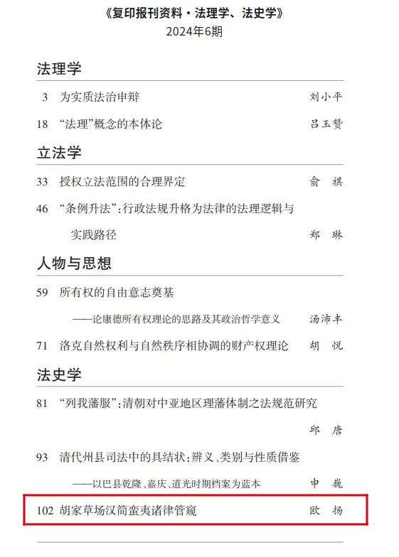 欧扬副教授的论文《胡家草场汉简蛮夷诸律管窥》被人大复印报刊资料《法理学、法史学》2024年第6期全文转载。