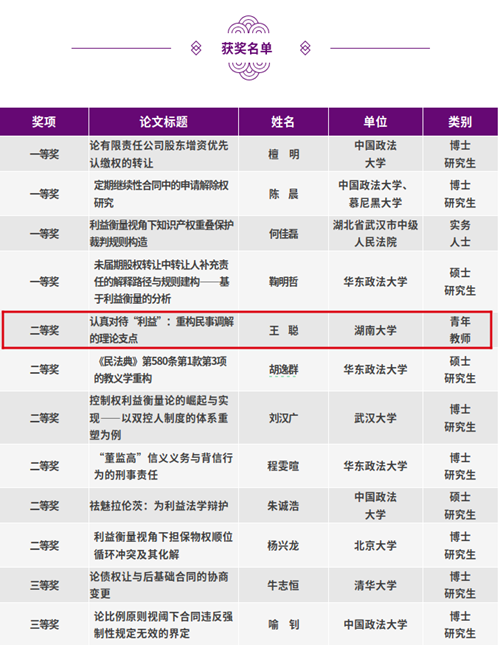 助理教授、法学博士王聪凭借论文《认真对待“利益”:重构民事调解的理论支点》获得二等奖。据了解,本次活动颁奖仪式将于2025年5月17日在同济大学五楼自拍