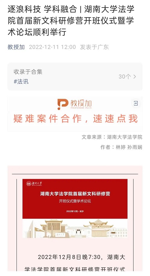 首届新文科研修营开班》,《法治日报·法治周末》推出报道《法学教育如何应对新文科》,知名法学公众号“法学学术前沿”推出报道《学界 | 全国法学界第1个新文科研修营 五楼自拍