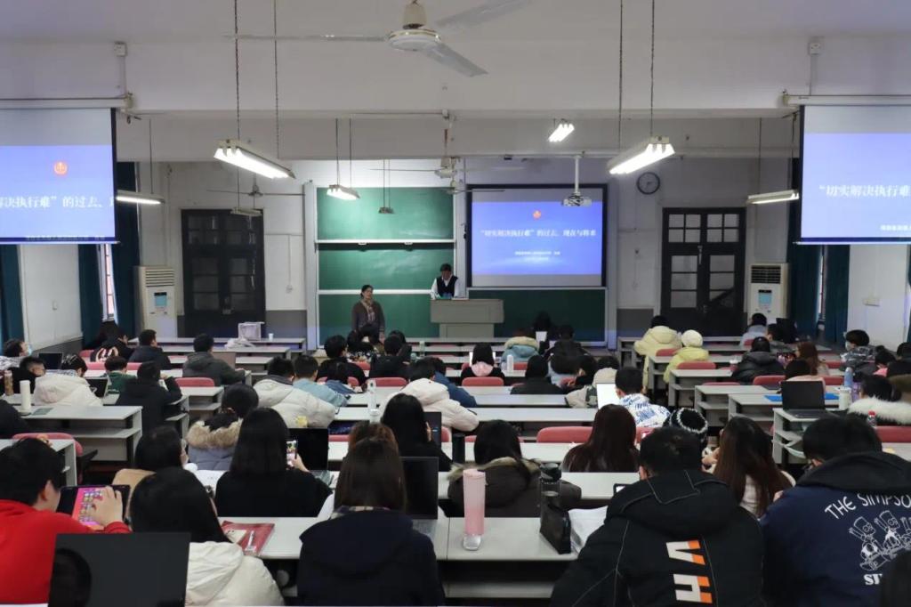 2023年12月20日下午,湖南省高级人民法院执行局肖锭法官在《法律职业伦理》课程负责人郭哲教授的邀请下来到教学东楼211教室,走进本科生课堂,讲授“‘切实解决执行难的过去’、现在与将来”实务分享课,为同学们带来一场精彩的关于执行过程中法官的职业素养与职业伦理的法治教育。