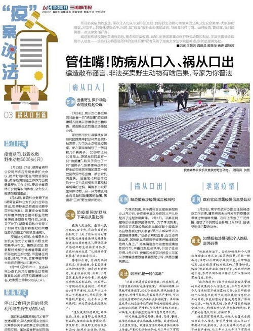 新冠肺炎疫情的发生,再次让人们认识到非法交易、食用野生动物可能带来的公共卫生安全隐患。大家纷纷倡议,对菜单上的野味坚决说不。同时,如“病毒”般扑面而来的谣言,与病毒同样可怕。 面对疫情,管住嘴,我们都需要一点法律免“疫”力。