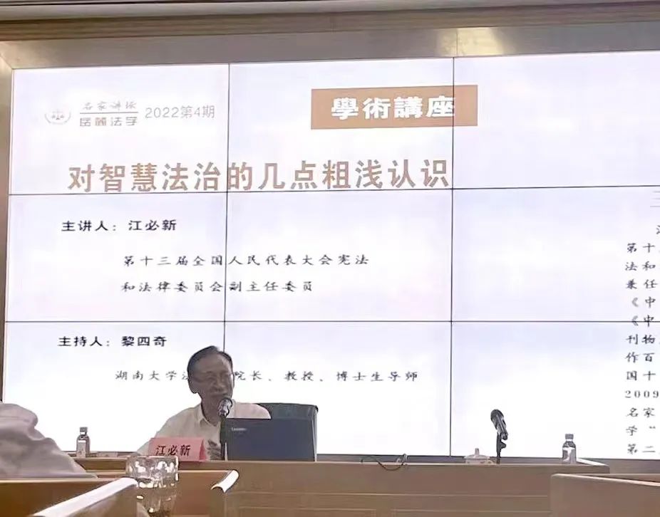 讲座伊始,江必新老师从智慧产权即知识产权的保护问题谈起,表示在信息快速传播的21世纪,知识产权的保护是亟待解决的问题,应当引起重视。他谈及了数字的法治化和法治的数字化。数字经济时代的加速到来深刻影响了经济社会的基本组织结构与生产消费模式,给原有社会治理的法治理念、原则、逻辑及方式方法都带来了深刻甚或是颠覆式的挑战。以数据、算法、平台为基础的数字经济社会三要素的一体化、协同化及法治化治理为视角,描述数字经济时代法治图景的真实样态不失为一种可行的研究方法。