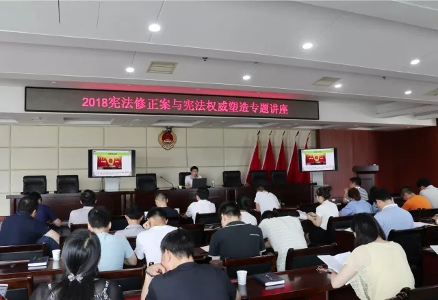 副教授蒋海松应邀担任主讲嘉宾,就“2018宪法修改与检察权重构”这一主题做了专题报告。宁乡市人民检察院党组书记、检察长钟孝明同志带领全院干职工现场聆听了报告。