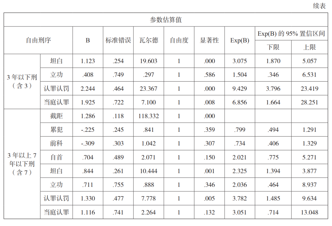 根据量刑指导意见,自首的基本从宽幅度为 0~40%,坦白为 0~20%,当庭认罪为 0~10%,认罪认罚为 0~40%,累犯为 10%~40%,前科为 0~10%。考虑到认罪认罚吸收自首、坦白等从宽情节而导致从宽幅度增大概率较高,各量刑情节影响力大小(不分正负)的应然序列为:认罪认罚 >自首 > 累犯 > 坦白 > 当庭认罪 = 前科。在上述模型中,EXP(β)回归系数,即 OR 值的大小反映了该情节的作用力大小,根据模型,量刑情节的实然价值序列为:在 3 年以下宣告刑中,认罪认罚 > 当庭认罪 > 自首 > 坦白 > 累犯;在 3 年以上 7 年以下宣告刑中,则认罪认罚 > 坦白。实然与应然对比,表明累犯的实际从严幅度不够,当庭认罪的实际从宽幅度过大,其余情节的裁量幅度较合理。