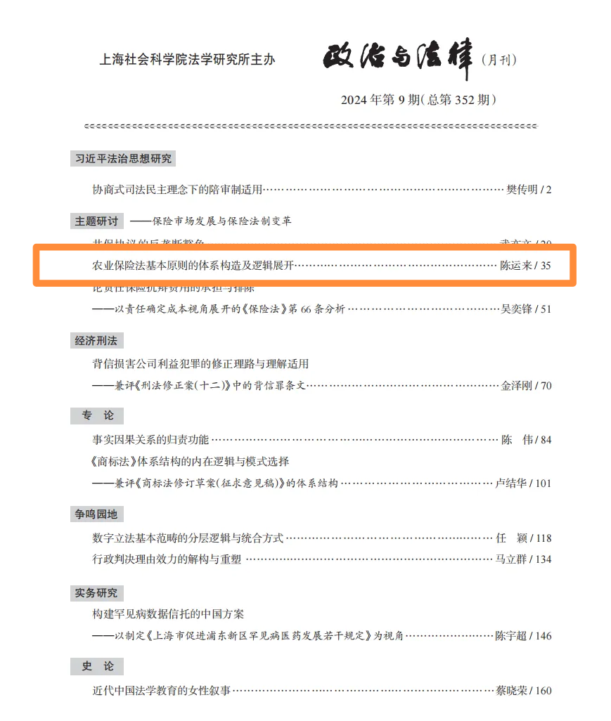 近日,五楼自拍 陈运来副教授在《政治与法律》(CLSCI来源期刊)2024年第9期发表论文《农业保险法基本原则的体系构造及逻辑展开》。