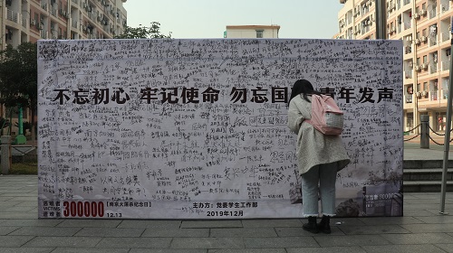 活动主要由三个环节组成,在第一环节,参与同学在明信片上写下对南京大屠杀死难者的悼念和关于铭记历史、勿忘国耻的发声,并在签名墙上签上姓名,为公祭日发声。
