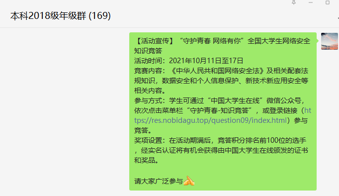响应开展国家网络安全宣传周校园日活动,各年级积极组织、广泛动员本年级同学参加“守护青春 网络有你”全国大学生网络安全知识竞答,并在低年级本科各班召开班会宣讲网络安全知识,意在提高学生安全使用网络和防范诈骗的意识和能力,推动营造安全和谐的校园网络环境,促进平安校园建设。