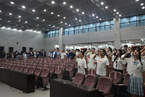 团长薛鹏飞带领全体新团员郑重宣誓,新团员肃然起立,立志尽己所能,帮助他人,服务社会,为建设美好社会贡献力量。