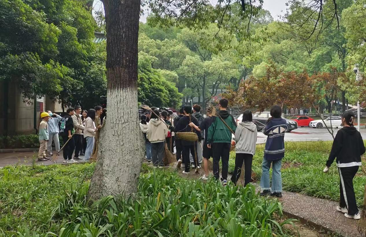 同学们被分配到工具后就各自寻找小组和划分区域开始打扫。一部分同学利用耙子将枯枝落叶从绿化带中清理出来,另一部分同学将枯枝落叶清理到垃圾袋中,在彼此的配合下,大礼堂周边终于清理干净。