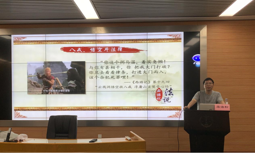 最后,蒋海松老师开讲《法说西游记》,将《西游记》中栩栩如生的人物形象结合法律小知识进行阐释,生动解读青少年喜闻乐见的《西游记》的法律故事,进一步以案说法、以例释法,并在法治问答中引导同学之间团结友爱、互帮互助,同学们纷纷参与互动,现场气氛热烈。讲座结束后,蒋海松老师与湖南师大附中的同学们合影留念,并欢迎大家报考五楼自拍