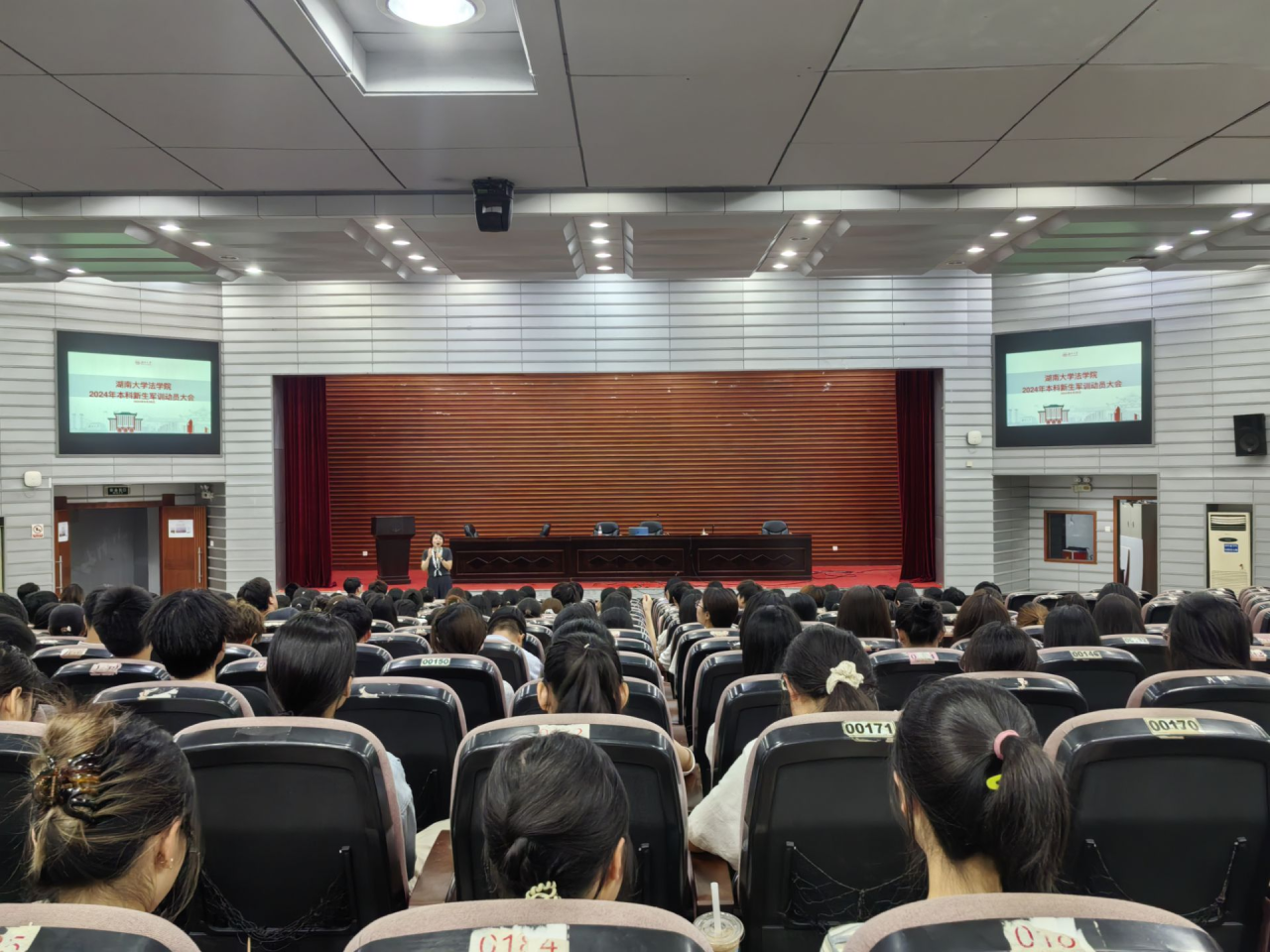 于三楼报告厅召开2024级本科新生军训动员大会,五楼自拍