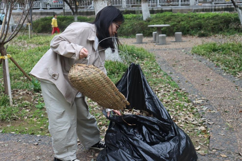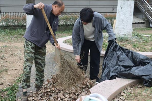 上午八点三十分,志愿者们于大礼堂门口准时集合。在负责人的分工安排及环卫工叔叔的悉心指导下,同学们分组协作,重点清理了大礼堂后广场及两侧花坛中积存的落叶和垃圾。初春时节,风干堆积的落叶不仅影响美观,还存在一定的安全隐患。志愿者们手持扫帚、垃圾夹等工具,细致清扫每一处角落,并将落叶集中装袋清运。尽管劳动强度较大,但同学们热情高涨,互相配合,现场井然有序。