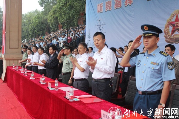 校党委书记刘克利同志在武装部副部长戴谋元同志的陪同下检阅参训方阵