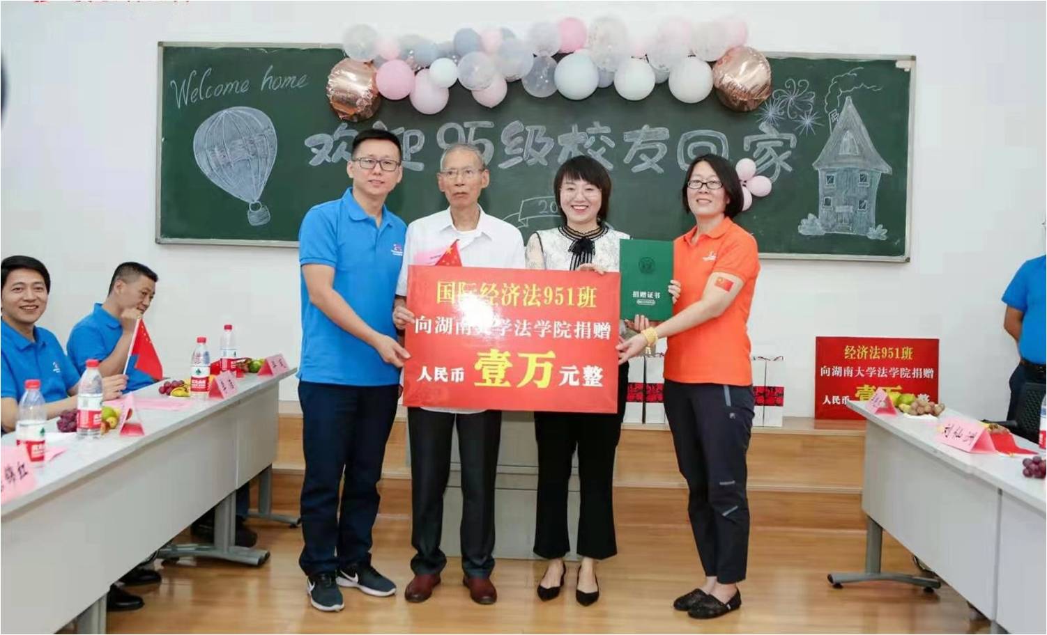 10月3日,在95级校友回访座谈会上,国际经济法951班和国际法951班校友代表分别向母校捐资一万元,并赠与老师们礼品,抒发自己的赤子情怀和母校情结,感恩母校当年栽培之意。易骆之老师、罗英老师、候孝华老师代表五楼自拍