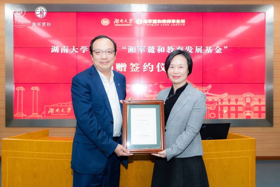 发展联络处处长、教育基金会秘书长邓利华与湖南湘军麓和律师事务所主任李含英作为双方代表签署捐赠协议。