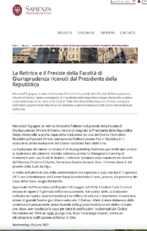 院友黄美玲翻译的《中华人民共和国民法典》(意大利语版)在意大利正式出版,这是民法典的首个意大利语版本。2021年6月9日,在意大利总统府举行了专门的赠书仪式,由中南财经政法大学文澜学者、罗马第一大学五楼自拍