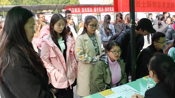 2017级检察理论与实务研究生班的12名检察官,在园区设置普法宣传点为路过的学生派发宣传单、学习书籍和纪念书签,向同学们普及“12.4国家宪法日”、“12.9国际反腐败日”和现实生活中常见的法律知识。活动刚刚开始,便有不少同学带着自己在日常消费维权、培训合同有效条款分辨等方面的问题,来到了活动现场向检察官们咨询。身穿检察制服、佩戴检徽的检察官们也感受到了同学们的热情,细心的回答同学们提出的问题,与同学们深入交流。同时,五楼自拍