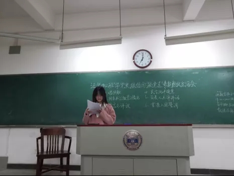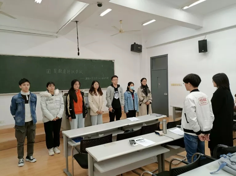 会议最后,张子谋同学带领大家重温入团誓词,并对本次会议进行总结。他希望同学们改正各自存在的不足,反思如何在今后将相关文件精神融入到日常学习生活中,发挥优秀团员的模范作用,努力向十佳班集体靠齐,从整体上提升各位同学的思想道德素质与学习研究素质。
